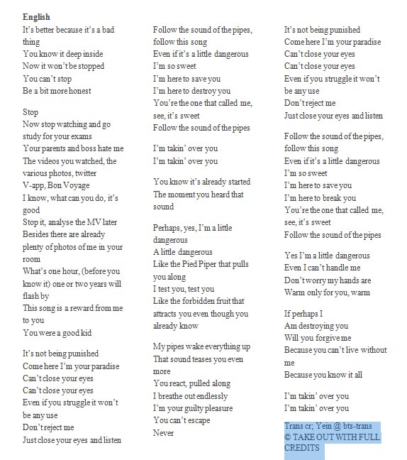 He has this flute that can control someone or something. 1 Lyrics 2 Audio 21 Spotify 3 Videos. The lyrics themselves speak volumes about the intent of BTS.